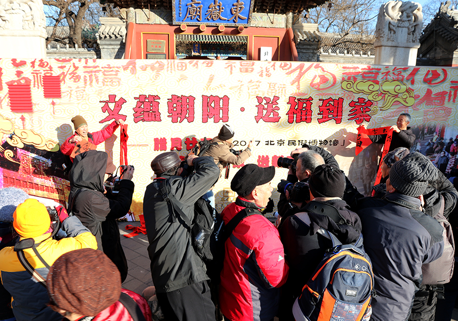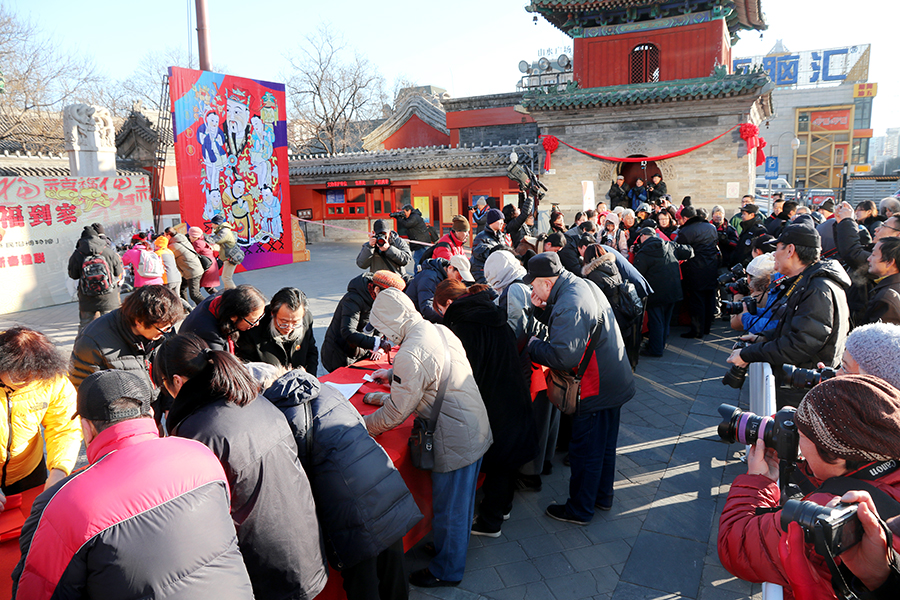 今天是腊月二十三过小年的日子,市民一早在东岳庙门前排起长队,等着领春联。此次活动也吸引了众多京城摄影人的关注。