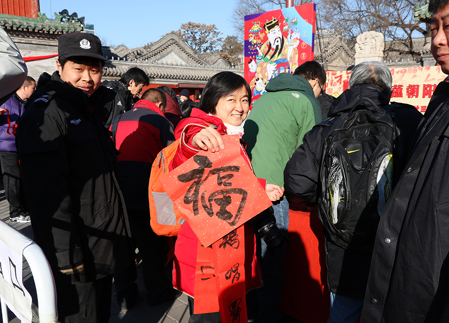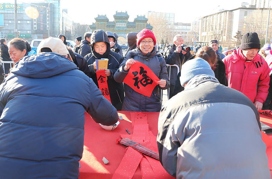 十位书法家协会的书法大师,现场创作春联和“福”字送给市民。据了解,东岳庙腊月二十三送春联的活动已经持续了近20年,非常受市民欢迎。