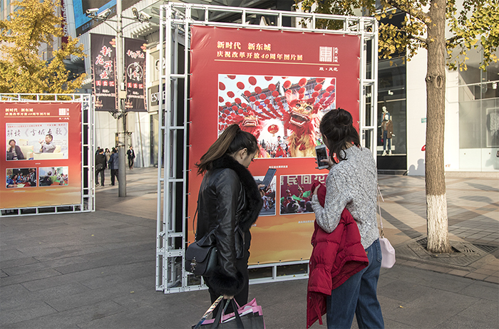 王府井大街的东城区庆祝改革开放四十周年图片展吸引了市民参观作者:王秀敏