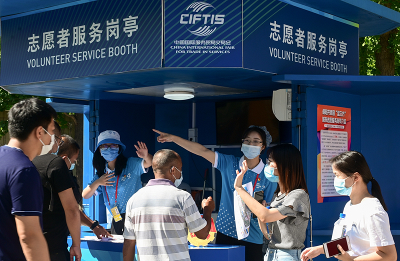 服贸会上的蓝马甲红马甲志愿者作者:卢斌