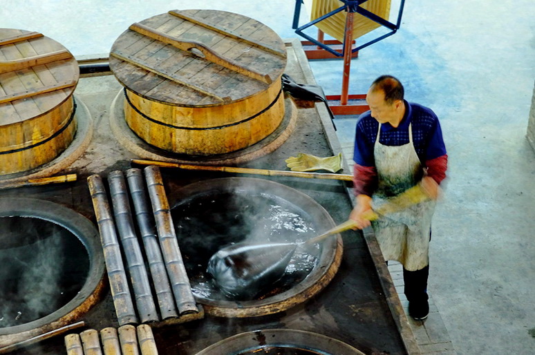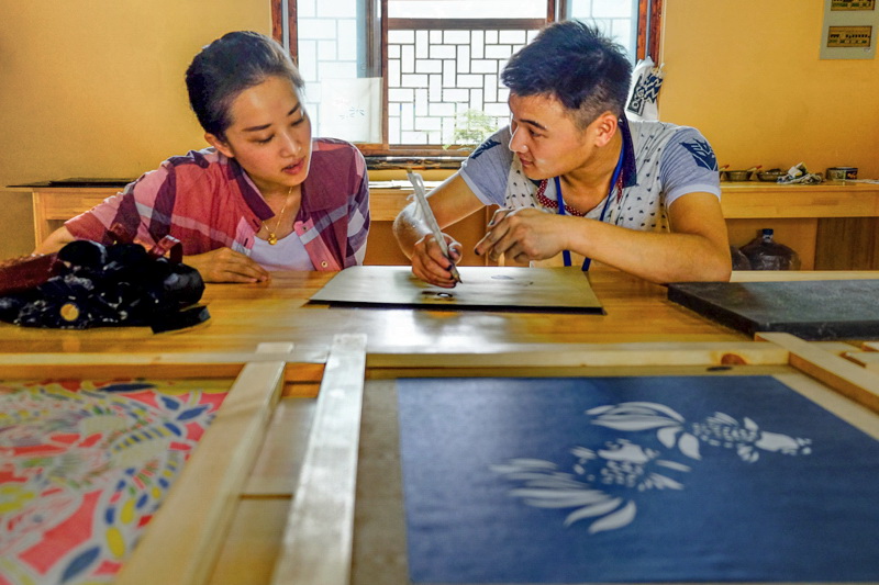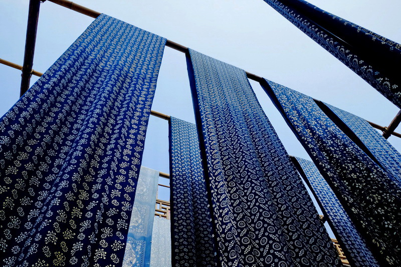 图片说说: 位于北京古北水镇的百年永顺染坊,不仅可以生产蜡染工艺品,而且建立了展览馆,供游人参观学习。(蜡染需要经过点蜡,染色,去蜡三个工艺流程,就会呈现出美丽的花纹)