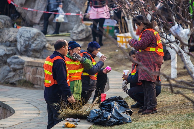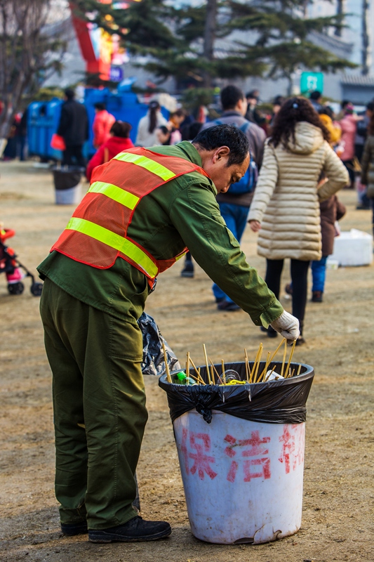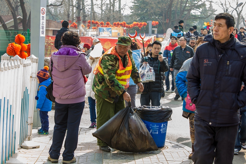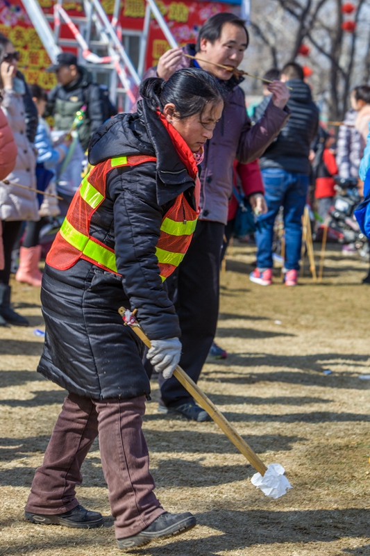 图片说说:春节庙会游人如织,环卫工默默工作,用辛苦换来了庙会的整洁环境。