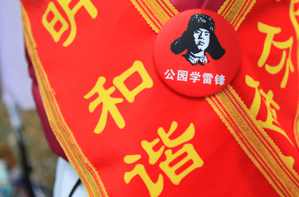图1集体宣传安全文明出行,图2公园学雷锋,图3学习公园指南,图4为游人发放资料。