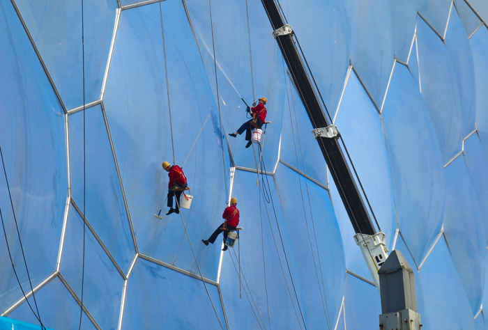 《美容》2018年6月24日,当日北京气温高达36℃蜘蛛人清洁水立方 作者:刘宏声 拍摄地点:水立方