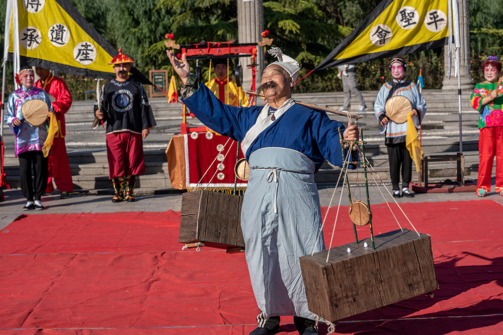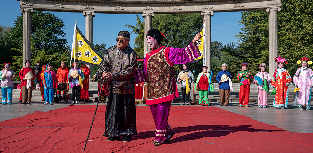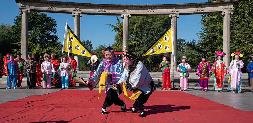 天平聖会 作者:刘金慧 拍摄地点:旧宫。天平聖会时一种过年,过节表演古老的花会,表演者大多六十多岁,由于缺少年轻人参与接近失传。图为旧宫的花会表演者十一期间为老百姓演出