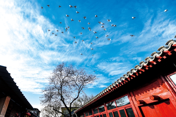 12月12日,刚完成架空线入地改造的樱桃斜街里,抬眼不再是线网密布,而是鸽子在蓝天飞翔 拍摄:邓伟