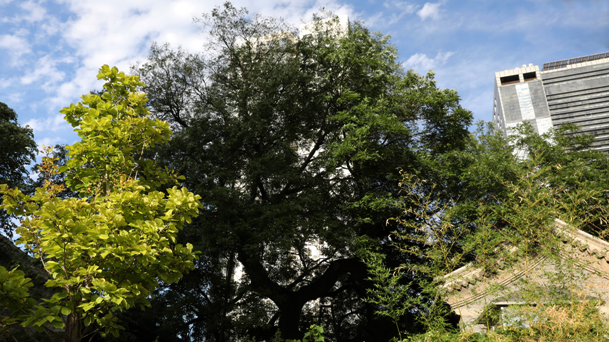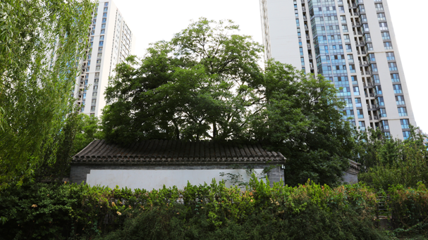往日游古寺时,听管理人员介绍,寺中的古国槐颇受市民的喜爱。春夏之际,停僮之时,常有人前来与古树合影。到了冬季,白雪飘落,还有摄影人专门来拍照,一展国槐的飒爽英姿。寺中看古树,多于树下仰望,枝叶分散,难以望尽。如今,只能站在寺门外看古树,却获得了不同寻常的视角。相比令叶绍翁欣喜的一枝出墙红杏,古国槐的庞大树冠带给人的却是满目苍翠,大可一饱眼福。