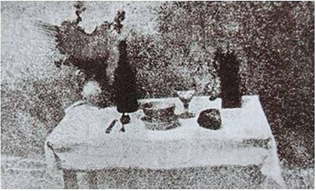 1822年,尼埃普斯使用涂了沥青的玻璃板,拍摄得到了照片《桌上的物品》,可惜原作已经失传,仅留下了复制品,而且长达几十个小时的曝光时间,缺乏实用价值,只是他发明的小序曲。