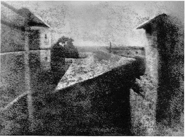 由于长时间曝光,两侧都留下了阳光照射的痕迹,这就是被认定为世界上的第一幅照片《窗外》,目前被保存在法国博物馆。尼埃普斯把他的方法称作“日光蚀刻法”,比达盖尔摄影术早了十几年。
