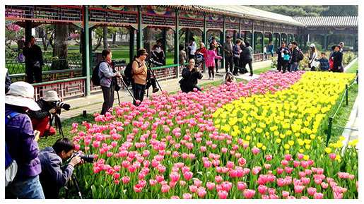 品种30余万株的郁金香等球根花卉,并首次从荷兰引进了“小美人”、“赛维斯特里斯”、“塔达”等三个原生种郁金香。在郁金香、草坪和古树之间,蜿蜒着一条棕色的木栈道,许多游客走到木栈道中间,置身花丛中拍照。据了解,每年郁金香节期间,特别是五一假期,都会有游客越过护栏蹲在花丛中间拍照,损害了郁金香和草坪,影响其他游客的观赏效果。中山公园管理处相关负责人介绍说,今年“变堵为疏”,在主要景区铺设木栈道,既让游客拥有更好的拍照角度,又不至于破坏植物。